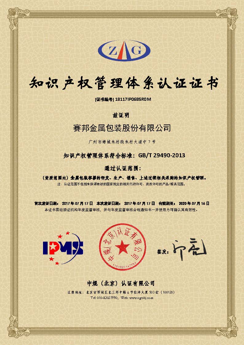 2017年7月17日,賽邦股份正式獲得《知識產(chǎn)權(quán)管理體系認證證書》,由此成為率先通過國家知識產(chǎn)權(quán)局《企業(yè)知識產(chǎn)權(quán)管理規(guī)范》認證的企業(yè)之一,目前成為金屬包裝行業(yè)唯一通過認證企業(yè)。
